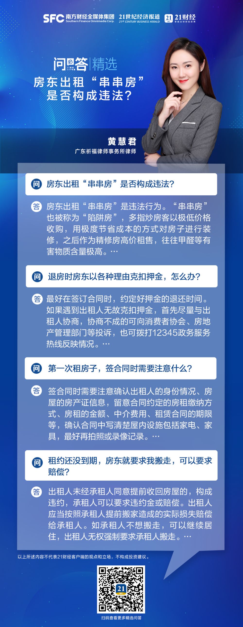 21财经客户端“问必答”特邀广东祈福律师事务所律师黄慧君,为广大用户解读租房话题。即日起,如果您有租房相关的问题,就来21财经客户端提问吧!现将近期黄慧君的精彩见解集纳如下,希望能帮您解开疑惑。