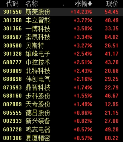 人形机器人概念震荡上涨,截至发稿,斯菱股份涨超14%,北特科技、丰立智能、一博科技等涨幅居前。